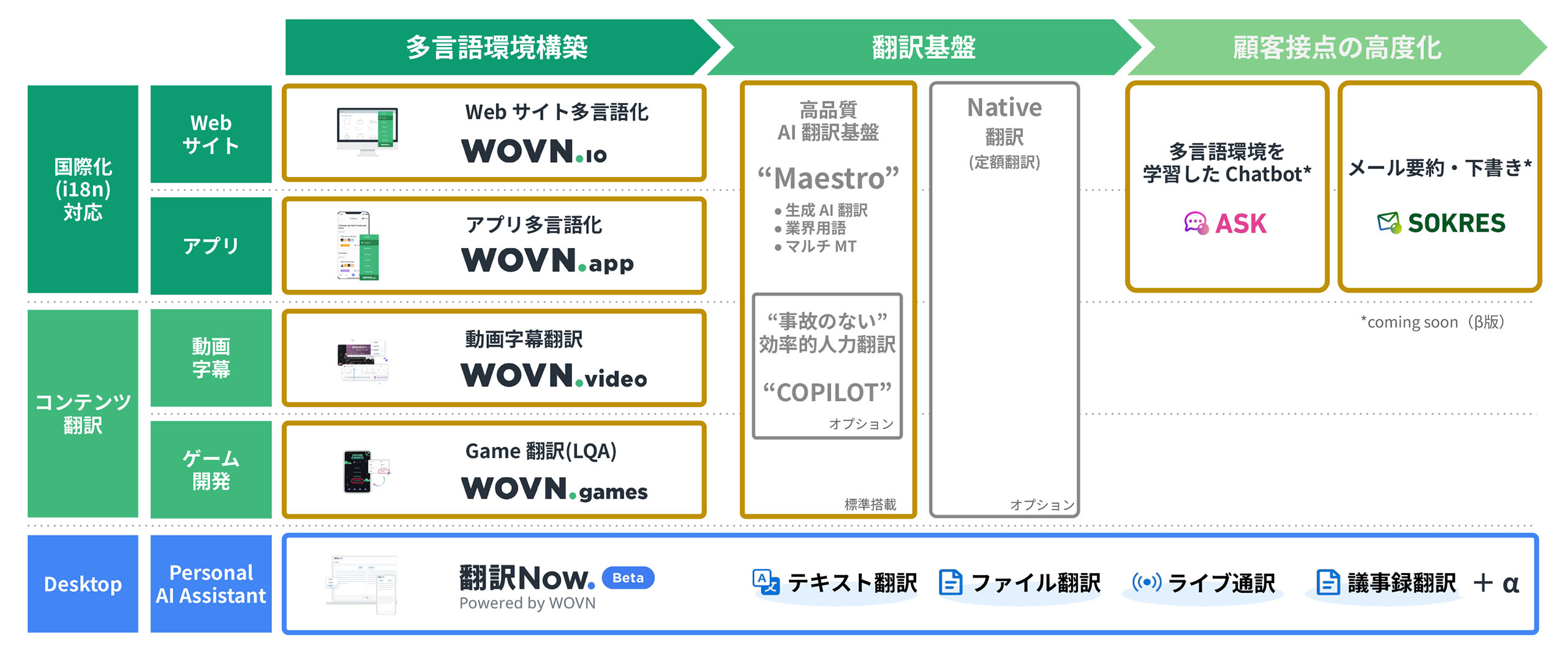 WOVNが注力しているのは大きく3つの領域です。一つ目は「環境構築」、多言語化の環境をつくるところ。二つ目は「翻訳基盤」、翻訳の基盤や運用の部分。三番目は「顧客接点の⾼度化」です。Webサイトはユーザーからすると顧客接点なので、その顧客接点をもとにより深いコミュニケーションをとれるようなソリューションを提供していくことが事業の主軸の一つです。