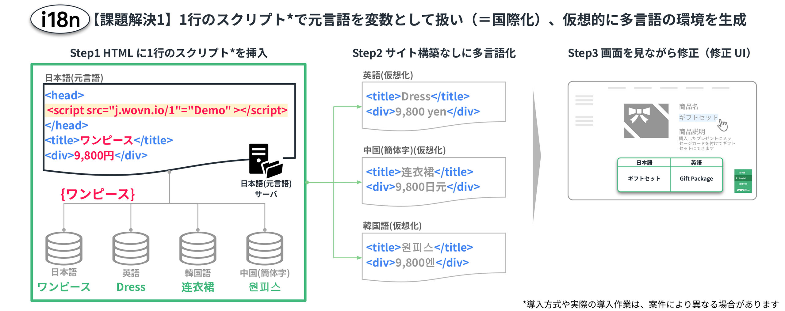 この多言語化の仕組みとして、WOVNはタグに囲まれた中身自体を変数化してしまいます。これが国際化、internationalization(i18n)の概念です。変数化してしまうと、例えば日本語で「ワンピース」と書かれたテキストが、英語なら「dress」、中国語なら「连⾐裙」、韓国語なら「원피스」と対訳の関係性、すなわちHTML構造を意識することなく、対訳だけを切り出したデータベースの管理に切り替えていけます。