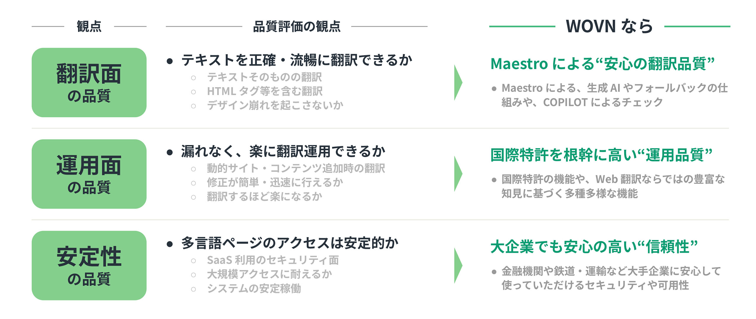 翻訳品質には、「翻訳そのもの」「運用面」「安定性」の3つがある