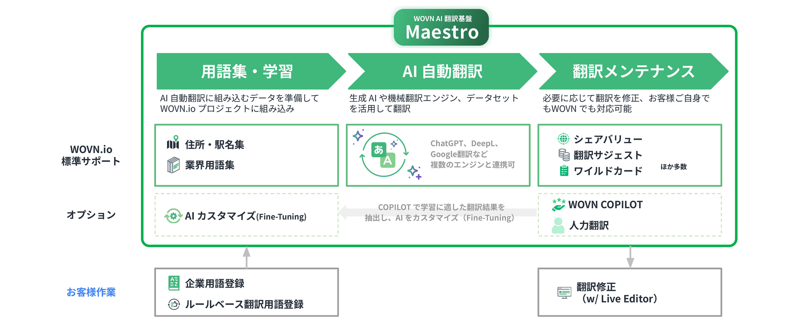 翻訳の強み、特徴的な部分としては「Maestro」というAI翻訳基盤があります。住所、駅名、あとは汎用的な業界用語集、加えて企業特有の用語を——会社名や社長の名前などですね——、用語集として登録した上で、AIによって自動翻訳する仕組みです。